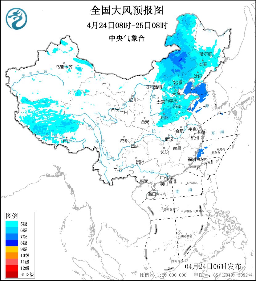 预计,4月24日08时至25日08时,内蒙古中东部、黑龙江西北部、吉林中西部、辽宁、河北、北京西部山区、天津、山东、河南中东部、江苏北部等地有5~6级、阵风7~9级的大风,其中,内蒙古东部部分地区平均风力可达7级、阵风10级;渤海、渤海海峡、黄海北部和中西部海域、东海西南部部分海域将有7级、阵风8~9级的大风。